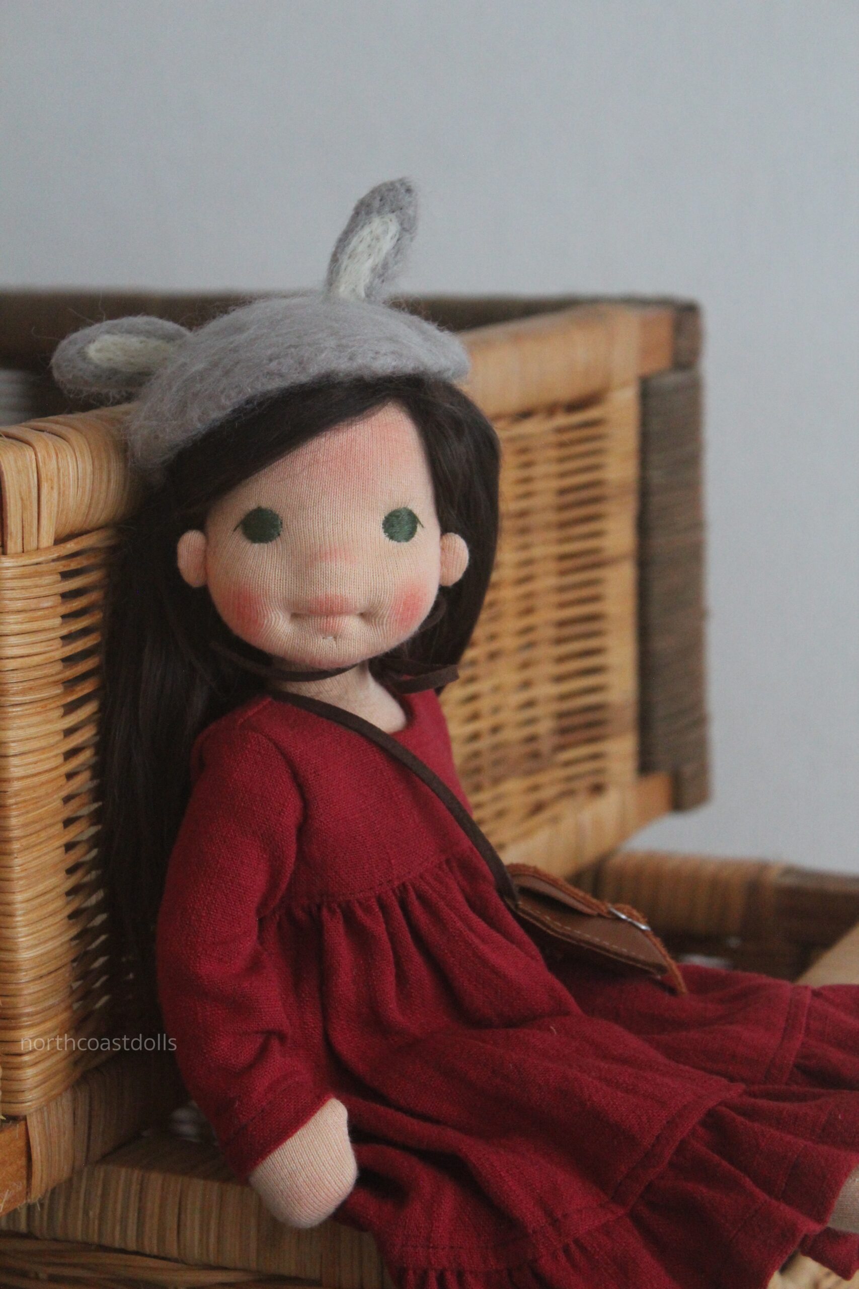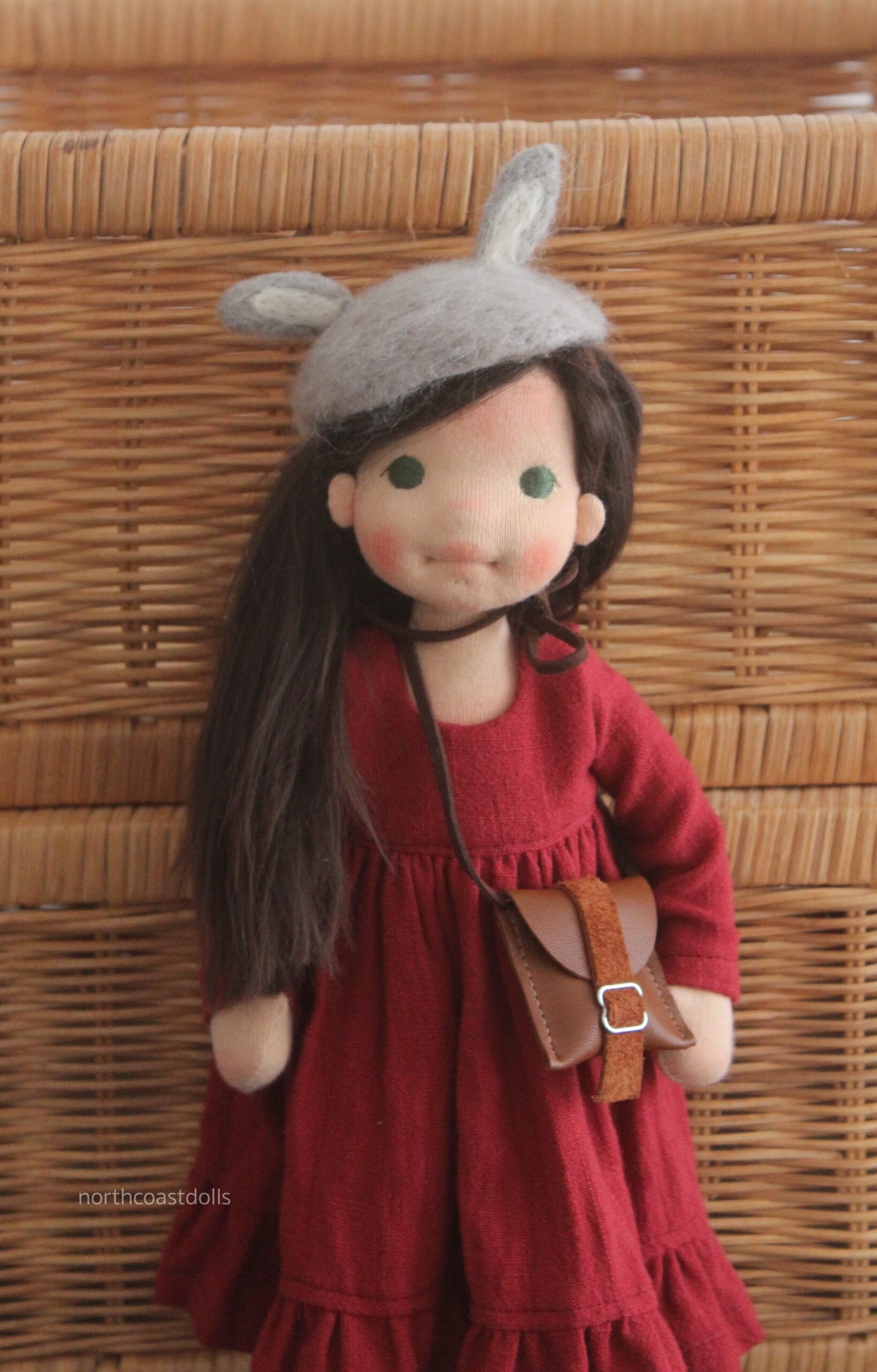 Miss Bunny stands 11 inches and she is created with natural materials. Her body is made with good smelling sheep’s wool covered with cotton fabric. Her soft dark brown alpaca hair nicely matches her sunkissed skin. She has got green eyes and her cheeks become rosy with the Fall wind. She is very playful, her head turns, her body construction and hard sole shoes allow her to stand.